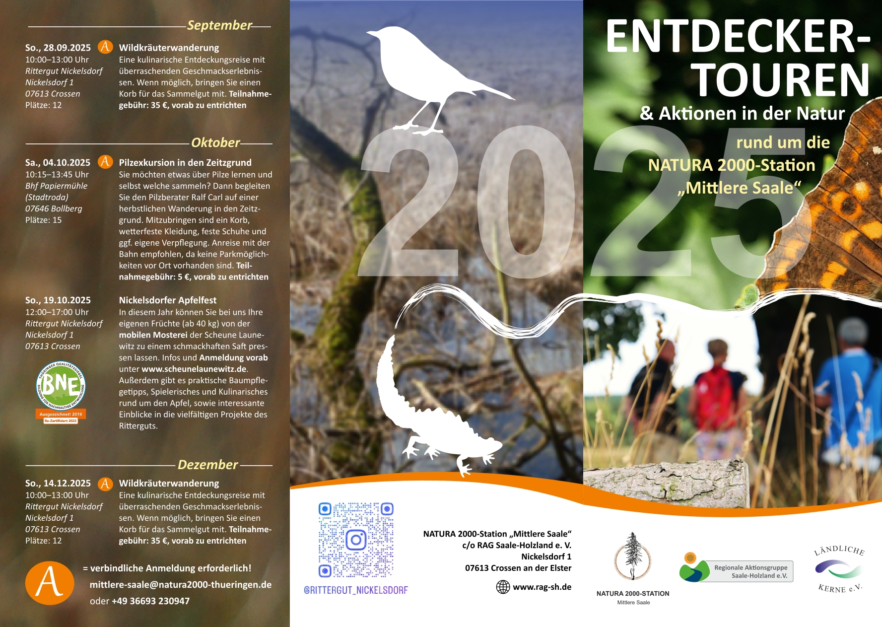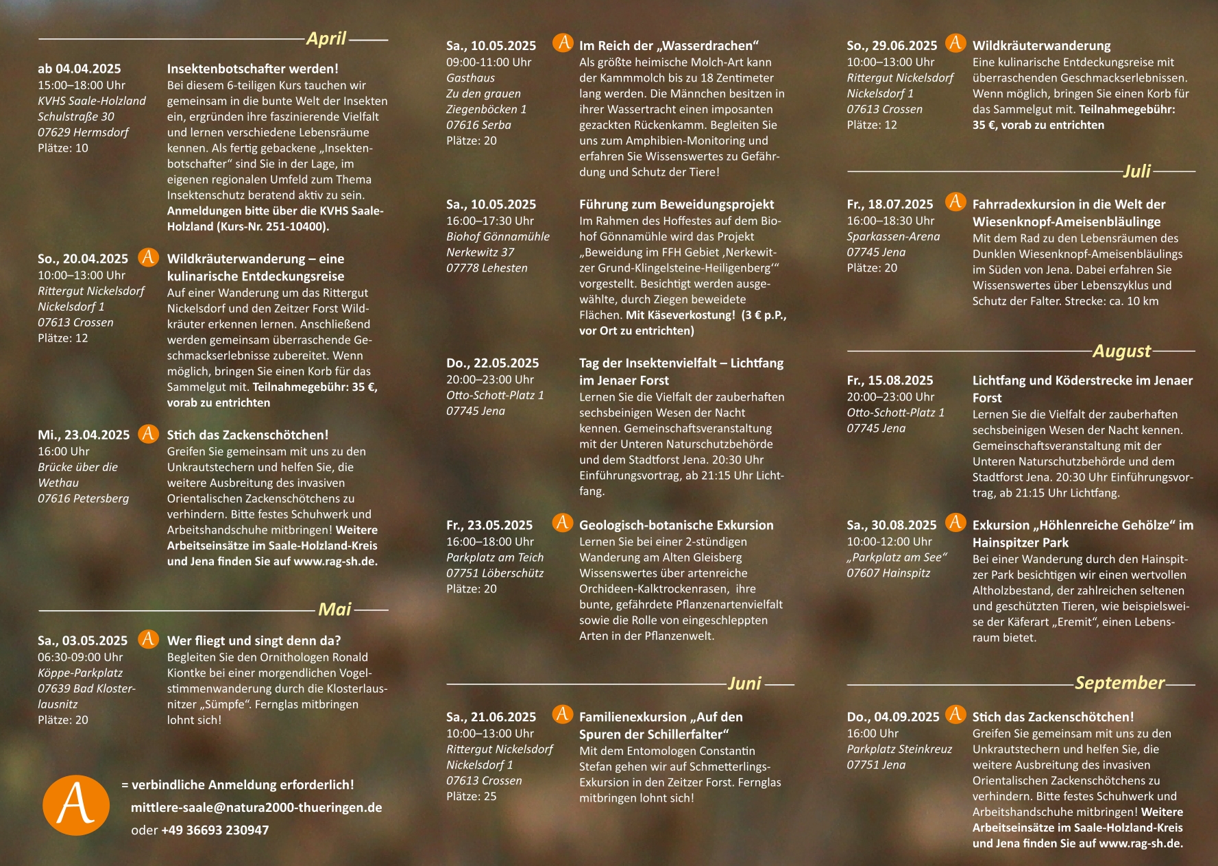 hier könnt ihr einen Blick in den Flyer für die „Entdeckertouren 2025“ werfen. Bei den Veranstaltungen, die mit einem großen „A“ markiert sind, bitten wir um eine verbindliche Anmeldung. Das Team der Natura 2000-Station freut sich darauf, viele neue und bekannte Gesichter bei den Entdeckertouren begrüßen zu dürfen!