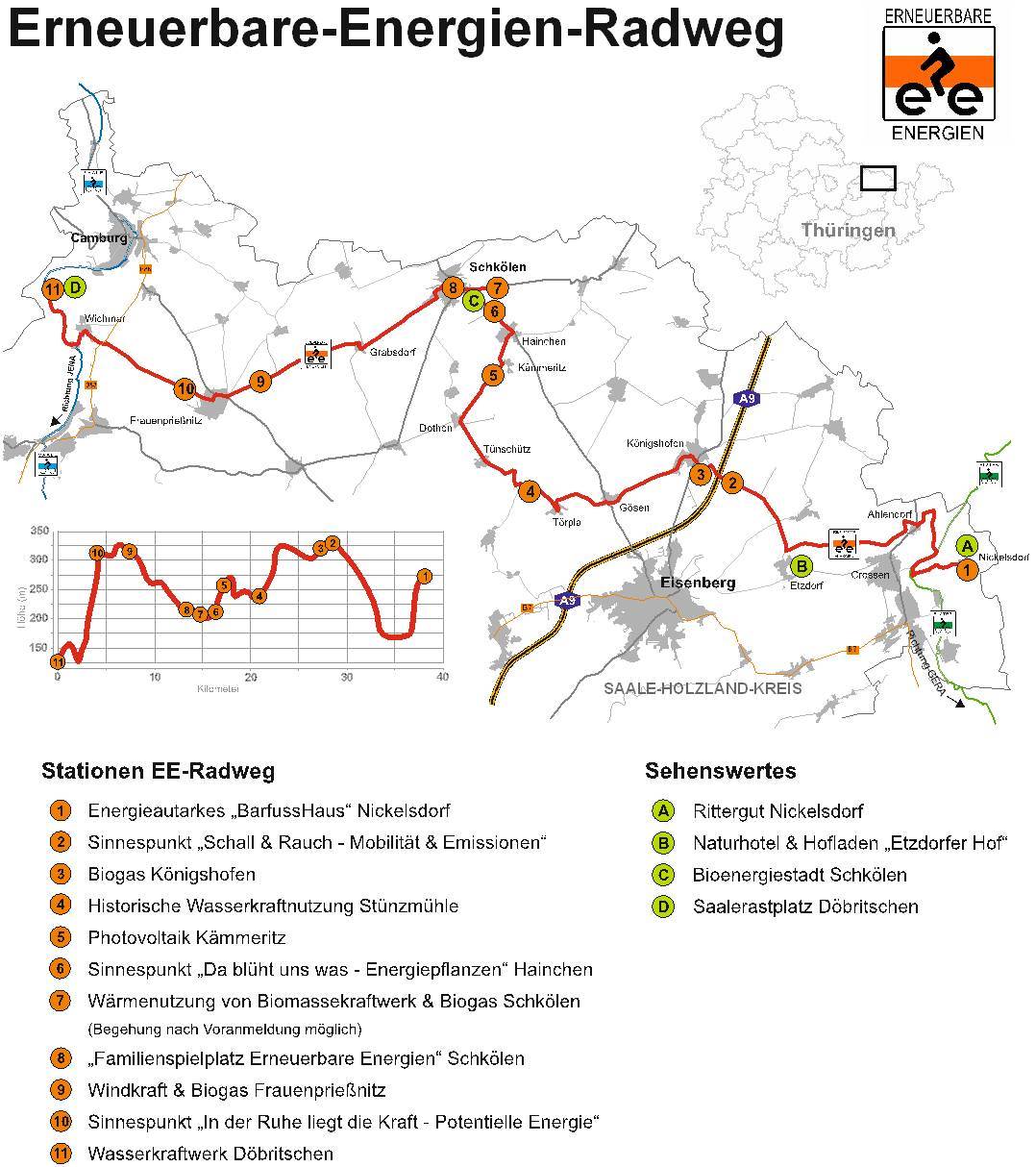 Beim Radeln nur die Natur genießen? Von wegen! Der knapp 40 km lange Energie Radweg bietet mehr. Zwischen Saale- und Elster-Radweg gelegen, führt er vom Barfußhaus beim Rittergut Nickelsdorf bis zum Wasserkraftwerk in Döbritschen. An Orten, an denen Energie regional und auf umweltschonende Weise gewonnen wird, laden Schautafeln ein, mehr zu erfahren. Verfahren zur Biomasseverwertung werden ebenso erklärt, wie Solar- und Windenergienutzung und das Potential der Wasserkraft. Neben gemütlichen Rastplätzen warten entlang der Strecke auch Gastwirte auf die Einkehr hungriger, durstiger und müder Pedalritter. Aufgrund der Topographie des erneuerbare Energien Radweges sei dem Genussradler ein Pedelec oder E-Bike empfohlen. Für sportlich Ambitionierte lassen sich die vielen ausgezeichneten Radwege der Region zu unterschiedlich langen Touren verbinden. Saale- und Elsterradweg bieten eine perfekte Nord-Süd-Anbindung, die Thüringer Städtekette und der Kirchenradweg eine Ost-West-Anknüpfung. Wer von hier aus weiter hinaus möchte, dem sei die Mittellandroute D4 ans Herz gelegt.