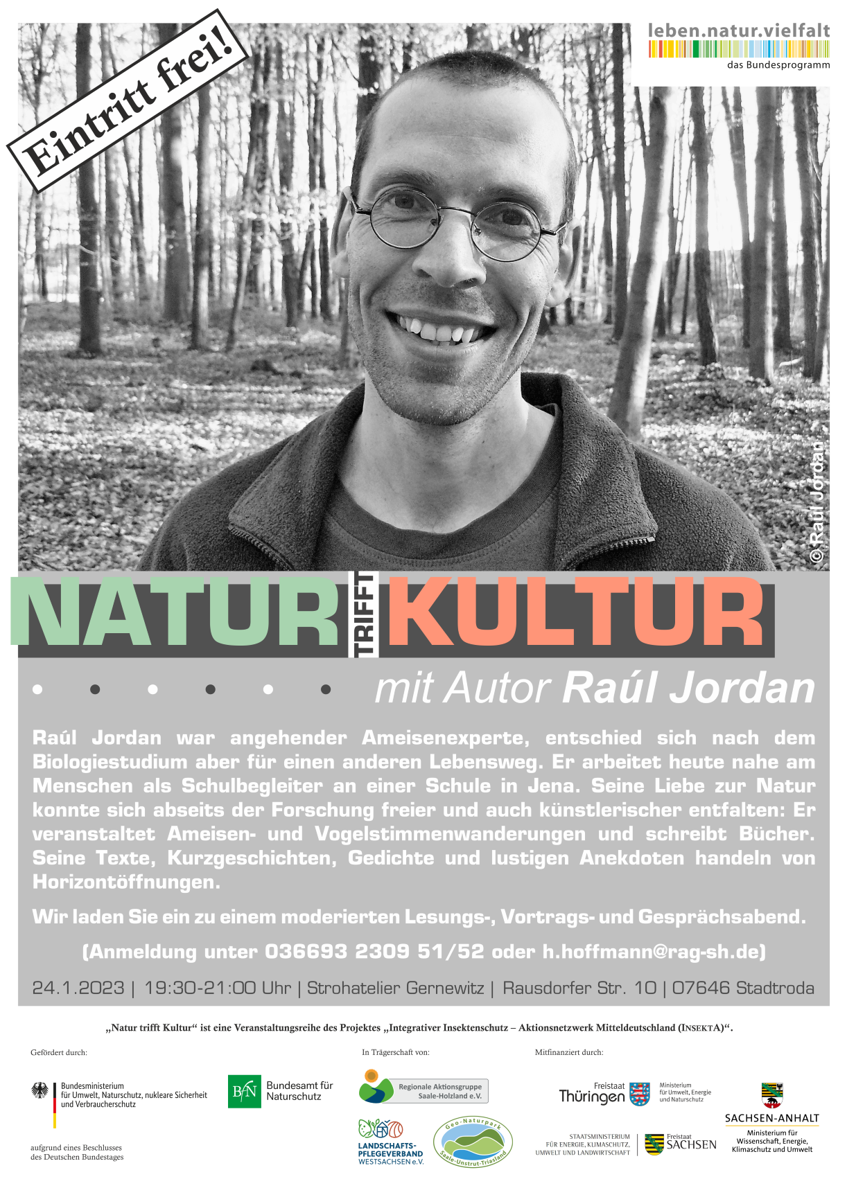 Zum Auftakt der Veranstaltungsreihe "Natur trifft Kultur" sind alle Interessierten am 24. Januar 2023 in das Strohatelier Gernewitz eingeladen. Gefreut werden darf sich auf einen moderierten Lesungs-, Vortrags- und Gesprächsabend mit dem Jenaer Autor Raúl Jordan. Die Veranstaltung findet im Rahmen des Projektes „Integrativer Insektenschutz – Aktionsnetzwerk Mitteldeutschland (INSEKTA)“ statt, das von der RAG Saale-Holzland mitgetragen wird.